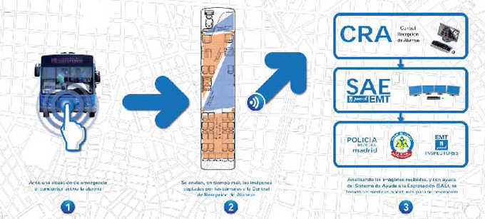 La Empresa Municipal de Transportes (EMT) de Madrid ha instalado un sistema de videovigilancia embarcada en la totalidad de su flota de autobuses. Este proyecto pionero en transporte urbano incrementa significativamente la seguridad de los usuarios gracias a las casi 9.000 cámaras que, instaladas a bordo de los 2.150 vehículos que circulan por la capital, permiten su supervisión en tiempo real, mediante la transmisión de imágenes a una Central Receptora de Alarmas de cualquier incidente o emergencia que se produzca en el interior de los vehículos.