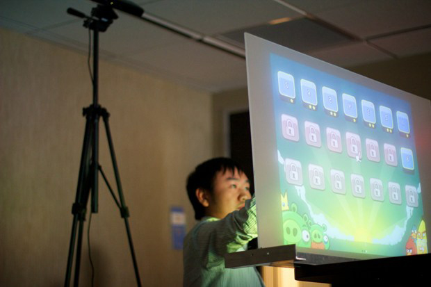 L'entreprise a fait une démonstration dans ses bureaux de Seattle, où il travaille avec Microsoft pour perfectionner sa création, allumer un projecteur classique sur un panneau de verre dépoli suspendu au centre de la pièce, celui qui était éclairé par une faible lumière. Un capteur Kinect a été installé de l’autre côté du panneau., qui capture les mouvements et les gestes de la main devant la vitre et envoie les données au logiciel UBI, fonctionnant sur le même PC Windows qui envoie l'image en direct à un projecteur.