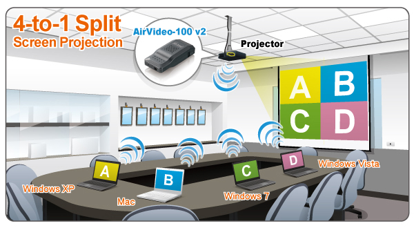 Otra característica de gran utilidad es la posibilidad de dividir la pantalla en 4 sectores de proyección. Par ici, cada uno de los dispositivos conectados a AirVideo-100v2 puede mostrar las presentaciones en el mismo monitor simultáneamente, aumentando la productividad de las reuniones. En plus, AirLive AirVideo-100v2 simplifica las presentaciones combinando Mobishow y Smartphone/ Tablet. El utilitario MobiShow lleva la pantalla del dispositivo móvil a una pantalla grande para reproducir fotografías y archivos PtG almacenados en el mismo teléfono móvil.