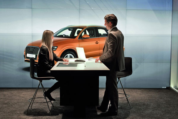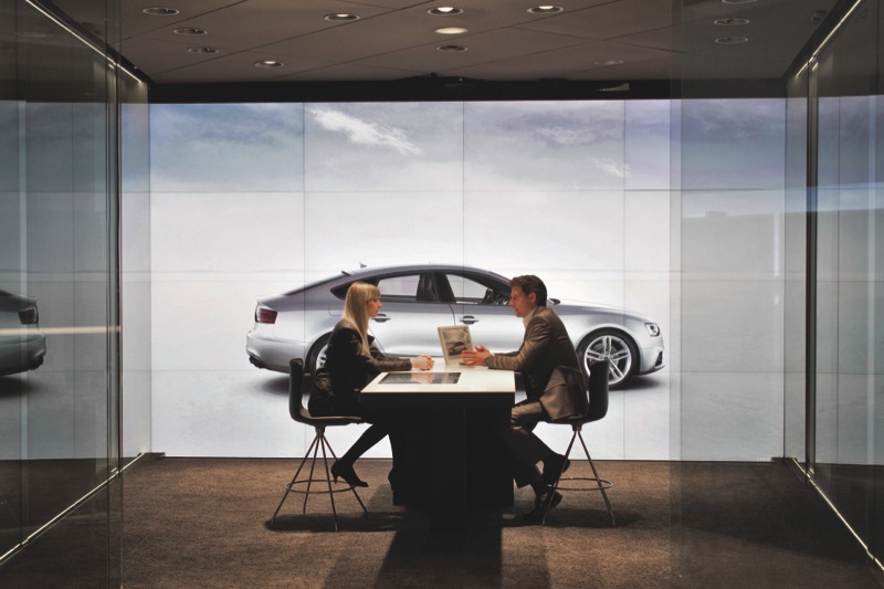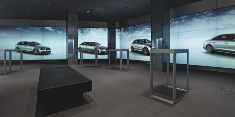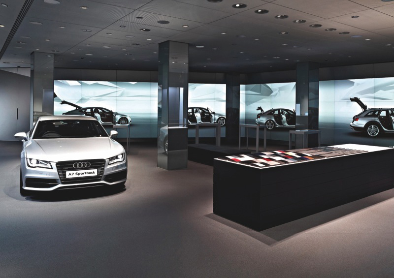 Una nueva concepción de concesionario nace de la mano de Audi en pleno centro de Londres, cerca de Picadilly Circus. Su nombre es Audi City y su principal característica es la ausencia de coches, al menos ‘en carne y hueso’. Au contraire, el cliente puede acceder a toda la gama Audi de forma virtual mediante unas pantallas gigantes de avanzada tecnología. Donc, se trata de un local totalmente adaptado, en el que hay pantallas gigantescas en las paredes desde las que se muestra toda la línea de vehículos de la marca a los clientes.