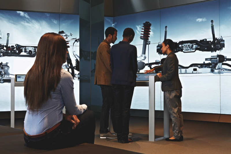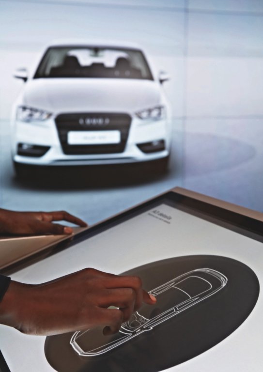 La nueva Audi City ofrece una experiencia innovadora al cliente gracias a la capacidad de controlar la pantalla y los menús utilizando gestos o movimientos que son leídos por una cámara situada enfrente. Entre las distintas pantallas y menús, cuenta con la posibilidad de ver el interior del coche, el motor y las llantas desde bien cerquita. Tras seleccionar el modelo, en las mesas táctiles se pueden escudriñar todas sus características y prestaciones sin moverse del lugar, y también se puede configurar el vehículo deseado con todo lujo de detalles: couleurs, cajas de cambios manuales o automáticas, sièges, llantas…y verlo en escala 1:1 en unos minutos, e incluso se puede conducir virtualmente como si se tratase de un video juego.