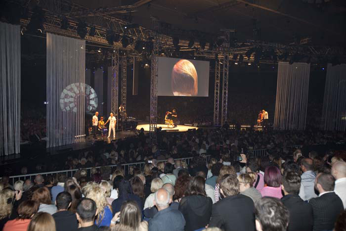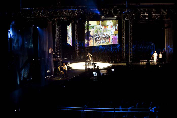 - Projection sur 3 écrans principaux, sur scène, de 5,2×3 mètres chacun, avec des projecteurs 20.000 Lumières Barco FLM HD