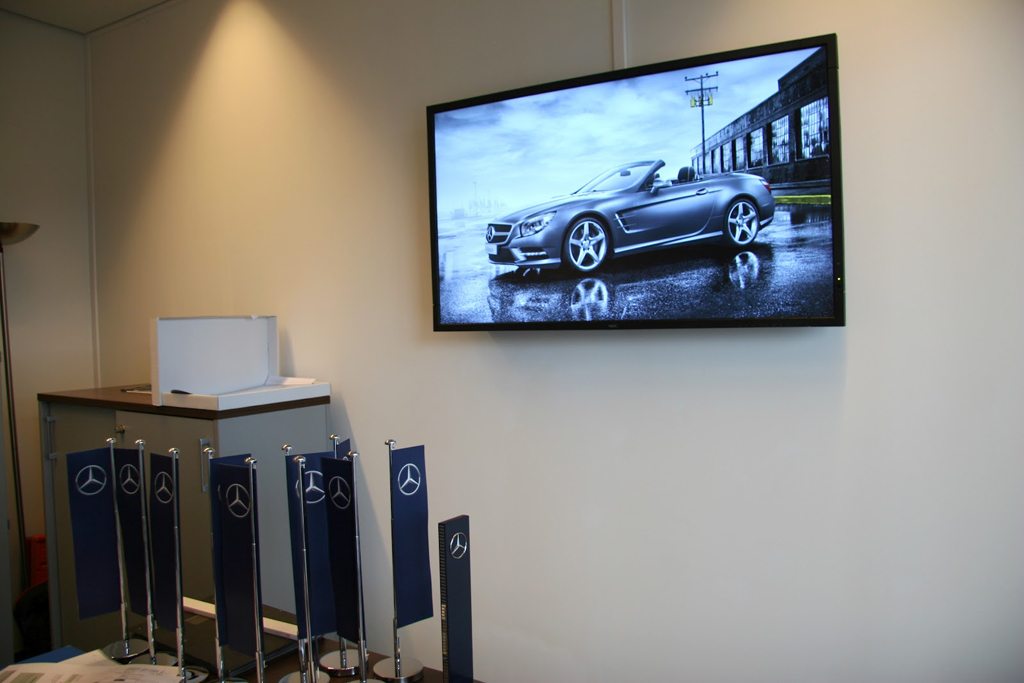 La empresa de digital signage belga iDklic ha desarrollado un concepto multi-pantalla para los concesionarios de Mercedes del país de Tintín que se basa en una pantalla de señalización digital conectada a un iPad que permite a los vendedores controlar el display desde la tablet para mostrarle a los clientes toda la información relevante de un automóvil (precio, des photos, videos, performance, etc.…) en temps réel.