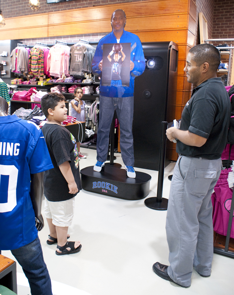 Rookie USA, una nueva tienda retail de alta gama alta que vende ropa deportiva para niños, ha echado mano de un curioso agente de ventas: el Carmelo Anthony Virtual. Creado por Tensator, una compañía de software que ofrece soluciones de marketing interactivo, esta imagen holográfica en 3D del jugador de los New York Knicks de la NBA proporciona información de la tienda y consejos de baloncesto.