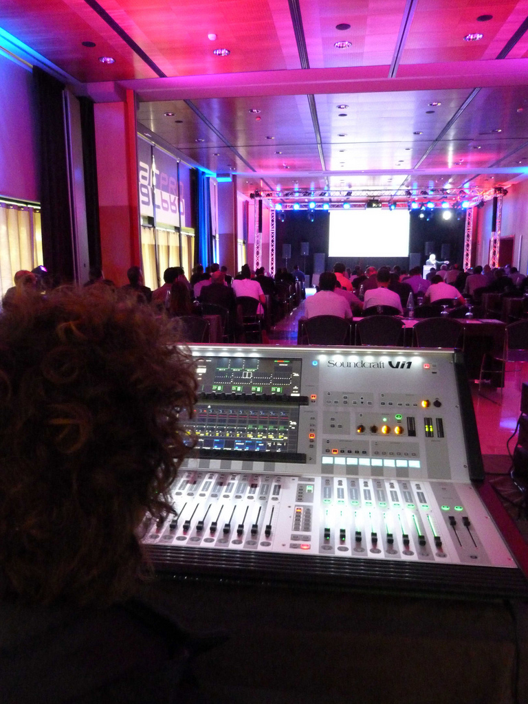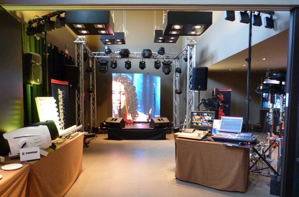 Le montage de la mini-scène était destiné à reconstituer une petite scène de concert, avec tous les produits d'éclairage les plus adaptés, comme les têtes mobiles Pageant (CM-120) de 12 puces polychromes, Lyres mobiles Sabre XP5-R 189W Beam et certains équipements BW 14-10 d'ACME pour offrir l'éclairage le plus spectaculaire possible. Tous les éléments de la salle de conférence, du plateau de diffusion et de la mini-scène étaient contrôlés par deux tables Compulite Ultra-Violet..