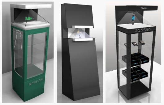 Los escaparates holográficos se pueden integrar en eventos (giras de promoción, convención, féria, presentación de producto, inauguración…) pero también para instalaciones permanentes (magasins, salle d'exposition, musées, megacines.)