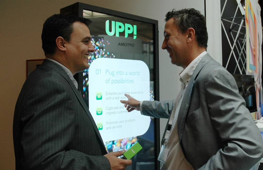 Philips, pour sa part, ofrecía un tótem con la solución digital signage UPP! (Upgrade Public Signage Player), controlable a través de tablets y smartphone via Android que permite nuevas posibilidades en el mundo de la señalización digital; y una pantalla táctil de 2 toques de 42″. Enfin, un proyector de tiro corto XD221-UST de Mitsubishi Electric proyectaba contenidos sobre una pizarra digital interactiva SMART Board 880.