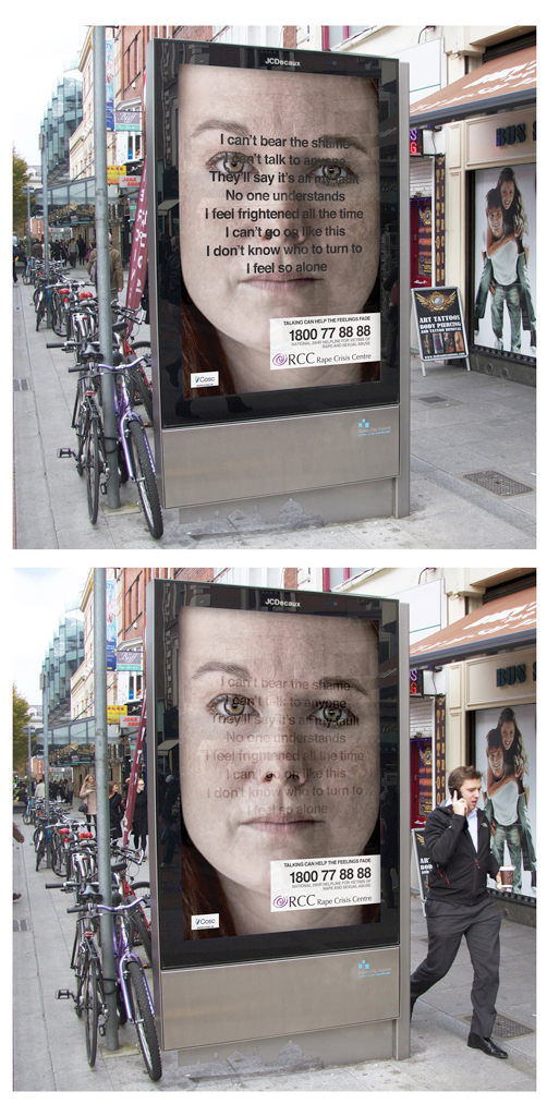 La filial irlandesa de la agencia de publicidad McCann Erickson, McCann Dublín, ha ideado una llamativa campaña de outdoor para la clínica de ayuda psicológica Rape Crisis Centre, una organización que ayuda a hombres y mujeres a recuperar su estabilidad emocional después de haber sido víctimas de secuestro o abuso sexual. Como parte de sus servicios ofrecen una línea telefónica de ayuda las 24 horas a través de la cual los pacientes pueden hablar acerca de sus problemas. La clínica sostiene que hablar del trauma psicológico es vital para recuperar la tranquilidad y volver a desarrollar la vida con normalidad.