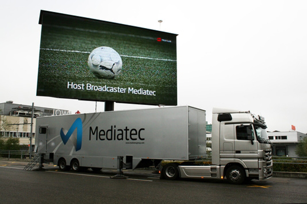 Reportage vidéo, compañía especializada en la prestación de servicios técnicos de producción y comunicación audiovisual perteneciente al grupo Vértice 360, oui Mediatec han presentado una solución única en España: un camión equipado con una pantalla LED de 56 m2 que supone un paso adelante en rapidez, eficacia y calidad de imagen en todo tipo de eventos. Esta pantalla ha sido desarrollada por DigiLed D12N de acuerdo con la normativa TÜV y siguiendo los libros de construcción requeridos por Baubücher. La imagen que proyecta tiene un formato de 16:9 y soporta una separación del pixel v/f de 12.5/25mm.