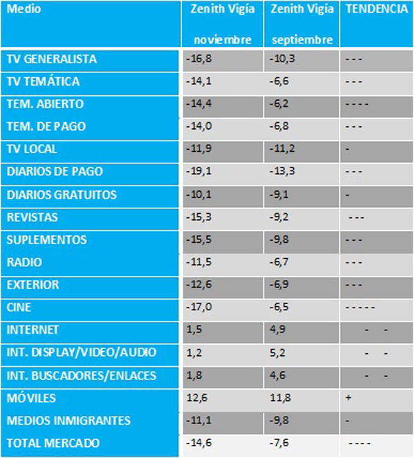 Le marché publicitaire diminue en taille à mesure qu’il se numérise. L’investissement capté par les nouveaux médias numériques, o les versions numériques des médias traditionnels ne représentent qu'une partie de ce qui sort des médias analogiques. Selon les prévisions du Zenith Vigía pour novembre, tous les médias, sauf les numériques (Internet et mobile) connaîtra des revers. Télévision, Le cinéma et la presse écrite chutent plus fortement que la moyenne du marché, tandis que la radio et la publicité extérieure diminuent, mais moins que la moyenne du marché. La télévision reste de loin le média qui capte la plus grande part des investissements mais perd des parts de marché pour la deuxième année consécutive.