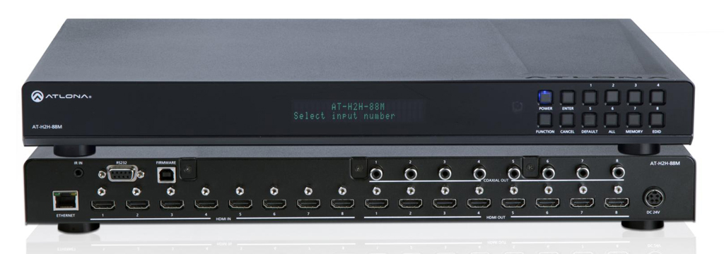 Atlona a mis sur le marché le nouveau commutateur matriciel HDMI 8×8 AT-H2H-88M, Conçu pour le routage du signal dans les grandes installations professionnelles. L'AT-H2H-88M est renforcé de fonctionnalités avancées telles que la gestion EDID, Sorties de boucle audio S/PDIF, plusieurs interfaces de contrôle, firmware actualisable in situ, et canal de retour audio (ARC).
