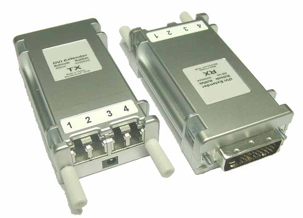 DVI05K-4LCSS-XX, que ofrece un enlace de hasta cinco kilómetros (resolución máxima de 1920 x 1200) utilisant quatre fibres optiques monomodes (1310 nm) con conector LC para poder unir un Tx y hasta treinta y dos pantallas (avec coupleurs optiques dans les installations fixes).