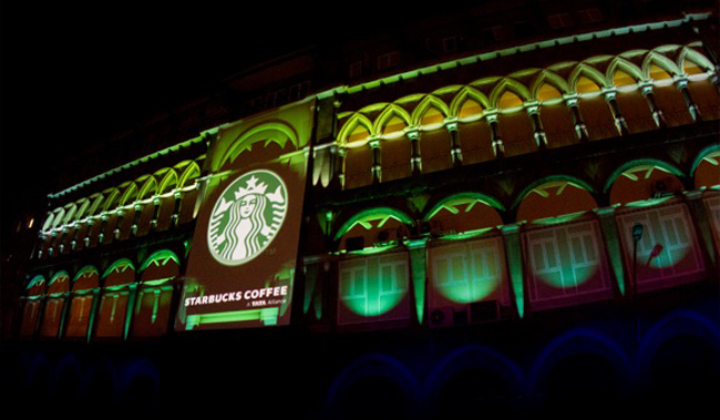 La popular cadena de cafeterías Starbucks recurrió a un impresionante video mapping desarrollado por la agencia holandesa NuFormer para la inauguración de su primera tienda en la India en el edificio Elphinstone, una histórica construcción en el sur de la ciudad de Mumbai.