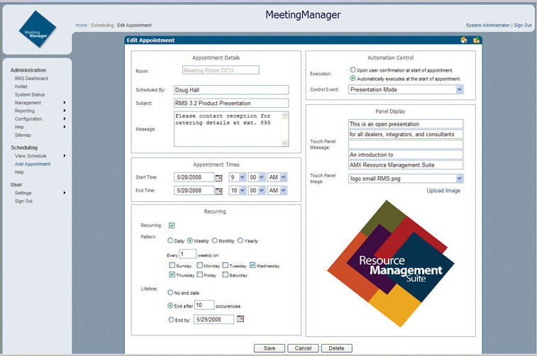 La fonction de planification du nouveau RMS 4.1 rend les utilisateurs plus efficaces, en veillant à ce que les salles de réunion et la technologie soient prêtes à soutenir et à diriger la réunion avant qu'elle ne commence. Une fois la chambre réservée, RMS 4.1 informera l'AMX Enova DVX présent dans la pièce, ou à un autre contrôleur intégré présent dans celui-ci, afin que je puisse configurer l'espace et prendre en charge les appareils. Lors d'une réunion typique, le projecteur s'allumera et l'écran s'abaissera, le PC s'allumera, le système de vidéoconférence fonctionnera et l'éclairage de la pièce sera réglé en conséquence. Lorsque les participants entrent dans la salle, L'équipement sera déjà configuré et prêt à fonctionner, gagner du temps et de l'argent. Et si la chambre était déjà réservée, ou la réunion a commencé avec un écran tactile AMX Modero X Series, La carte d'identification NFC du présentateur peut vous identifier sur l'écran tactile et configurer l'espace selon les exigences prédéfinies du présentateur..