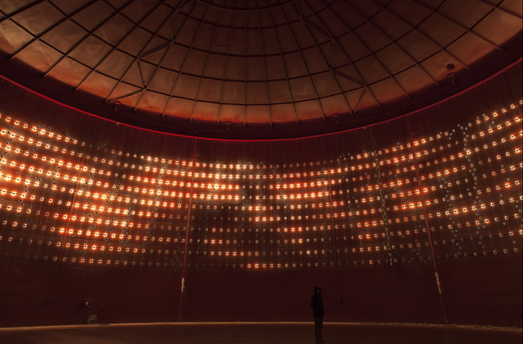 à l'intérieur, pintado de color rojo oscuro, la luz diurna se filtra a través del patrón derivado del patrón de oxido original en las paredes. La pared encarada al Norte no tiene perforaciones. Tras las perforaciones se han instalado 450 espejos de acero movidos por los vientos. Con la luz del sol el silo se llena de brillos como la superficie del agua. La red de LEDs blancos reflejan la luz indirectamente en el espacio a través de las paredes de color rojo. Los patrones en movimiento son como veloces halos corriendo a través de las paredes.