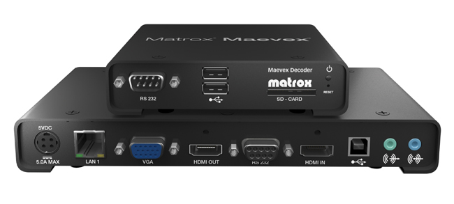 La plataforma de distribución de video Matrox Maevex ofrece extensión de señales de video codificado H.264 unicast uno a uno o multicast uno a muchos sobre redes TCP/IP convencionales a través de cable estándar (CATx) ou connectivité sans fil (Wi-Fi), para una transmisión y visualización de video de calidad excepcional con resolución Full HD 1080p @60Hz. Los codificadores y decodificadores Maevex capturan, sacan y decodifican video a partir de una variedad de fuentes, y permiten también la decodificación basada en software desde dispositivos que no sean de Maevex. El decodificador también puede actuar como sistema de señalización digital individual, que admite la reproducción en pantalla de contenido H.264 almacenado de forma local.
