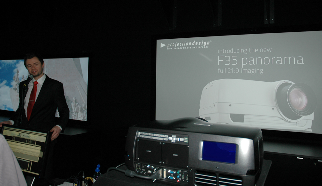 conception de projection ha presentado en la feria Integrated Systems Europe el primer proyector DLP panorámico basado en su modelo F35. Le modèle a été conçu spécifiquement pour être utilisé dans les salles de réunion et autres espaces de collaboration, où les utilisateurs doivent partager un large éventail de contenus d’images graphiques, con objeto de crear un espacio de trabajo de formato de imagen muy ancho sin la necesidad de fusión de bordes.El proyector ofrece una relación de aspecto excepcionalmente amplia de 21:09 o 2.37:1, que dans un environnement avec une hauteur de plafond moyenne, permet la création d'images jusqu'à quatre mètres de large avec un seul projecteur. Le panoramique F35 a une résolution de 2,7 mégapixels -a 35 pour cent de plus que le Full HD- et un éclat de 7.000 Lumens ANSI.