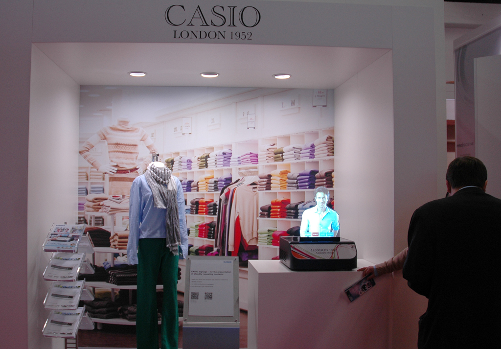 La pantalla de Casio Signage tiene la forma del personaje o de la persona, y se refiere a los posibles visitantes a la tienda para llamar su atención. El contenido es actualizable para mantener el interés de los visitantes: una tienda minoristas le proporciona a Casio una imagen fija y un texto. Luego Casio anima la imagen y añade la voz. No se requiere la producción de vídeo para las tiendas. Este proceso hace que sea muy fácil de actualizar.
