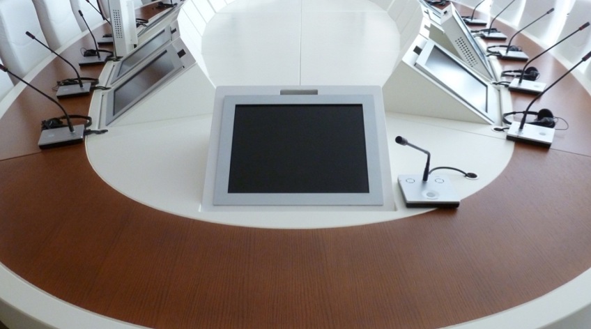 El sistema de video presentación consiste en un sistema de cámaras y de distribución de video y se utiliza para dar soporte a las necesidades de las conexiones de la videoconferencia, así como a todo tipo de presentaciones. Las cámaras profesionales instaladas tienen ópticas con aumento de hasta 27 fois, y dan la posibilidad de posicionamiento automático hacia el orador que enciende su micrófono en la conferencia. El sistema también incluye pantallas de proyección motorizadas y proyectores DLP de 4000 ANSI Lumens. La señal de video se distribuye a cada proyector individualmente, lo que permite la proyección de imágenes diferentes en cada pantalla. Se han instalado unos bastidores en las paredes laterales de la sala donde cuelgan monitores profesionales de 40″ con la capacidad de cambiar el ángulo de visión, mientras que los delegados sentados en la mesa de conferencia podrán seguir la acción a través de su propio monitor integrado. Estos monitores para los delegados se han instalado con distribuidores-amplificadores adecuados y gracias a sus carcasas realizadas a medida, es posible subirlos y bajarlos para conseguir el ángulo de visión deseado.