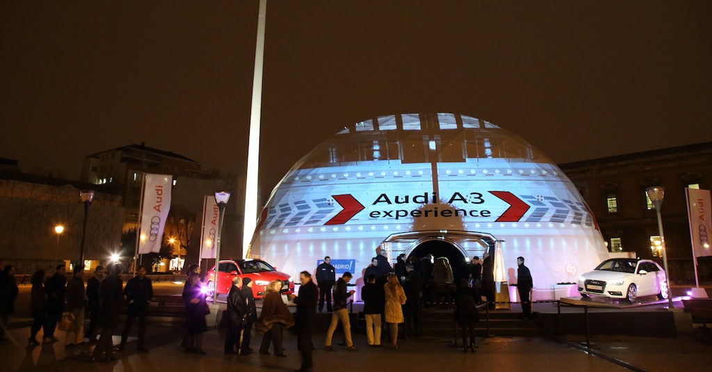 Audi ha puesto en marcha en Madrid y Barcelona la ‘Audi A3 Experience’, una experiencia audiovisual impactante que combina proyecciones 360º, mapping 3D y Show Master Control para dar a conocer el nuevo modelo A3 Sportback.