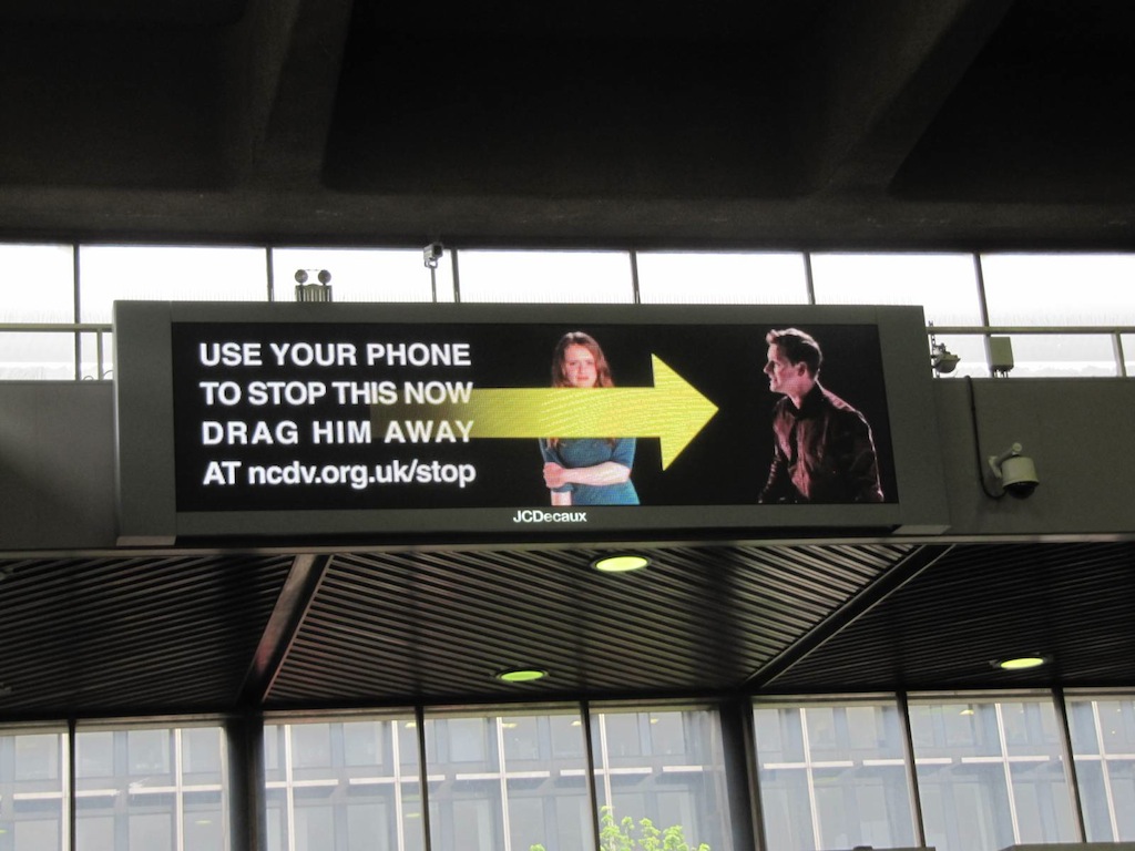 El National Centre for Domestic Violence (NCDV) de Londres ha utilizado la tecnología de señalización digital para una de sus campañas de concienciación y que las personas interactúen, a través de sus móviles, para poner fin a esta lacra social.