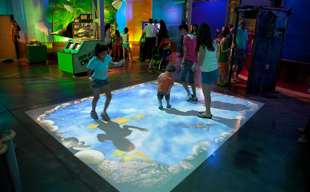 La solución EyePlay, diseñada con la tecnología MotionAware, se basa en una pantalla que se proyecta en el suelo y se activa cuando alguien se mueve encima, ofreciendo una plataforma de juegos virtual que permite a varios participantes (jusqu'à 15), interactuar con coloridos gráficos y sonidos.