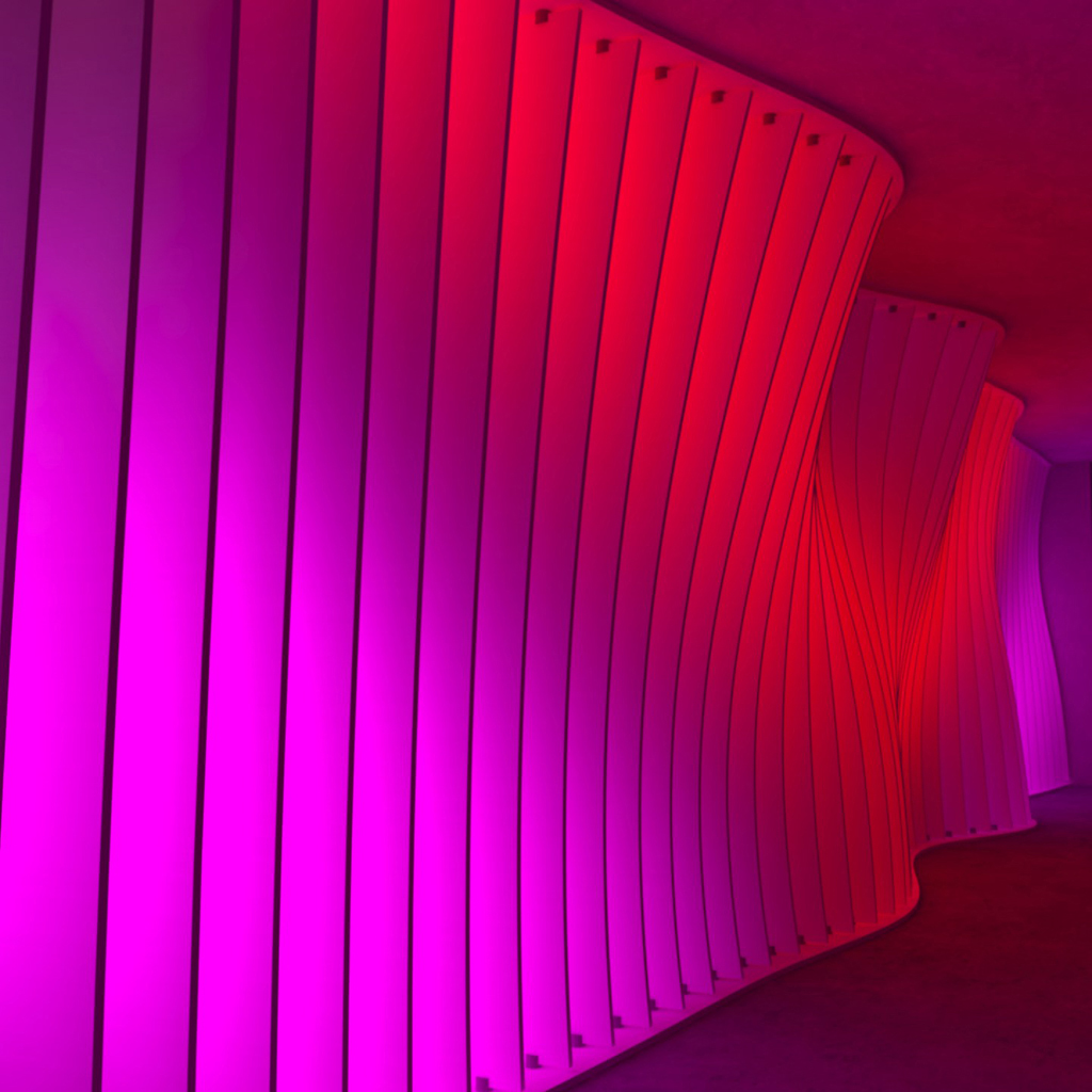 El diseño de la luminaria ha corrido a cargo de la empresa InSense que optó por utilizar la línea waves para decorar su interior. Se trata de estructuras formadas por piezas planas colocadas secuencialmente en vertical y horizontal que dibujan una superficie ondulada irregular. Las estructuras ocultan la fuente de luz y funcionan como difusor.