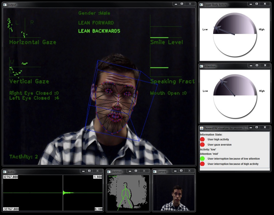 Ces développements utilisent la technologie de capture visuelle Microsoft Kinect pour analyser les expressions faciales, postures du corps, détails sonores, modèles linguistiques et détecteurs de comportements complexes en temps réel, grâce à des algorithmes visuels.