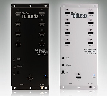 Gefen Toolbox 01:08 Splitter para HDMI 4Kx2K distribuye una fuente de alta definición AV a ocho pantallas ultra HD simultáneamente sin pérdida de calidad o resolución. Este sistema funciona con cualquier fuente de alta definición y soporta resoluciones de hasta 3.840×2.160 a 30Hz (4K x 2K) y 1.080p full HD.