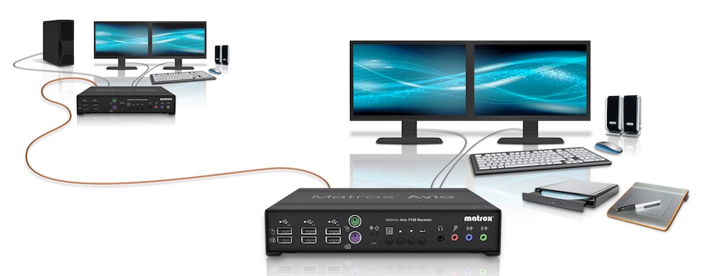 La multinationale Graphiques Matrox ha desarrollado un extensor KVM por fibra óptica, denominado Avio F125, que permite alejar dispositivos de vídeo HD dual, clavier, souris, audio analógico estéreo y USB 2.0 de la estación de trabajo.