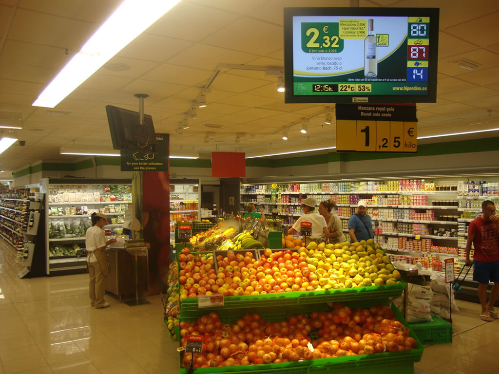En los dos despliegues se han instalado un total de 24 écrans NEC de 32 oui 42 pouces, sistemas táctiles para la gestión y monitorización de turnos en las secciones de perecederos, tecnología de voz virtual para la generación de mensajes asociados a las campañas y avisos ad hoc, así como canales de música ambiente integrado con la programación televisiva.