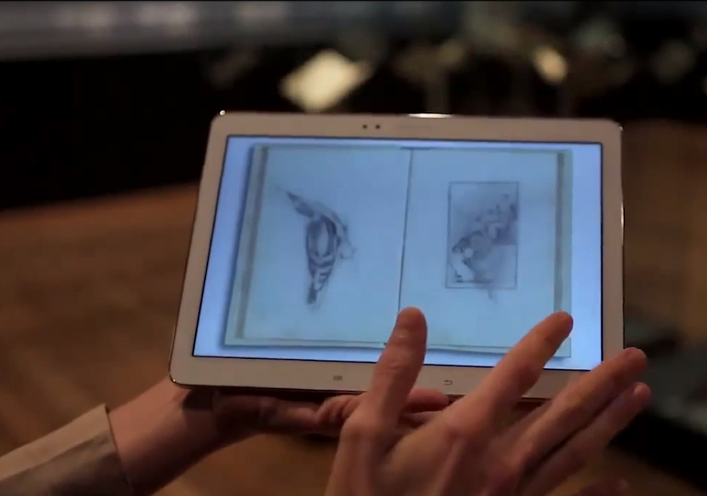 Comme dans toutes les expositions de ce genre, Les cahiers sont protégés par des vitrines et ne peuvent être touchés. Pour cette raison, Samsung a fourni ses tablettes Note 10.1 2014 Edition, avec une application développée ad hoc, permettre aux visiteurs de feuilleter les cahiers, tourner les pages et même développer les détails. Ceci est possible grâce à la numérisation de chaque page des cahiers.