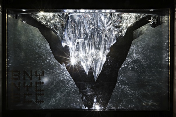 Un elemento abstracto y de grandes dimensiones, que hace pensar en una estalactita o un gran carámbano, se ha cubierto con miles de espejos rotos. Una proyección de mapping de Christie baña este elemento para crear un show de luces dinámico que se refleja por todo el espacio, en los escaparates y hasta en la calle. Entre las tecnologías empleadas se encuentra los proyectores de Christie HD14K-M, LW720 y LWU420, así como displays Christie HD de panel plano, como el nuevo WeatherAll panel plano para exteriores.