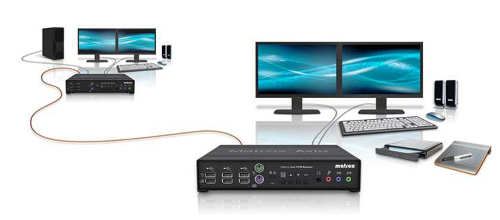 El extensor KVM por fibra óptica Matrox Avio F125 permite alejar dispositivos de vídeo HD dual, clavier, souris, audio analógico estéreo y USB 2.0 de la estación de trabajo. Proporciona opciones de conectividad flexibles. Su par transmisor/receptor extiende dos señales de vídeo DVI de enlace único (2×1.920×1.200) o una señal DVI de enlace dual (2.560×1.600 ó 4.096×2.160), así como diversos dispositivos USB 2.0 de alta velocidad desde el PC host a una distancia de cuatrocientos metros a través de un cable multimodo y de 4 Km con un cable de modo simple. Este extensor tiene capacidad de transmitir todas las señales sin ninguna compresión ni latencia con un solo cable de fibra óptica dúplex LC-LC.