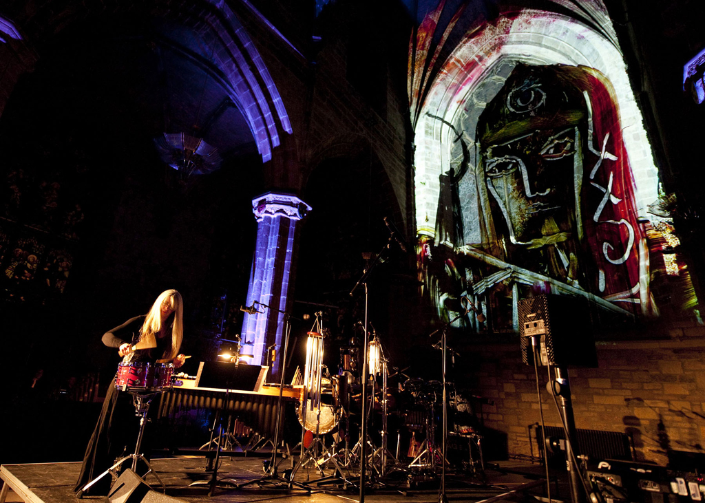 Dans la cathédrale St.. Gilles, Les images sont apparues en direct à travers les vitraux situés au fond de l'autel., quelques projections gigantesques de 16 mètres de haut par 9 large qui ont été créés à l'aide d'un projecteur Panasonic PT-DZ21K WUXGA monté verticalement.