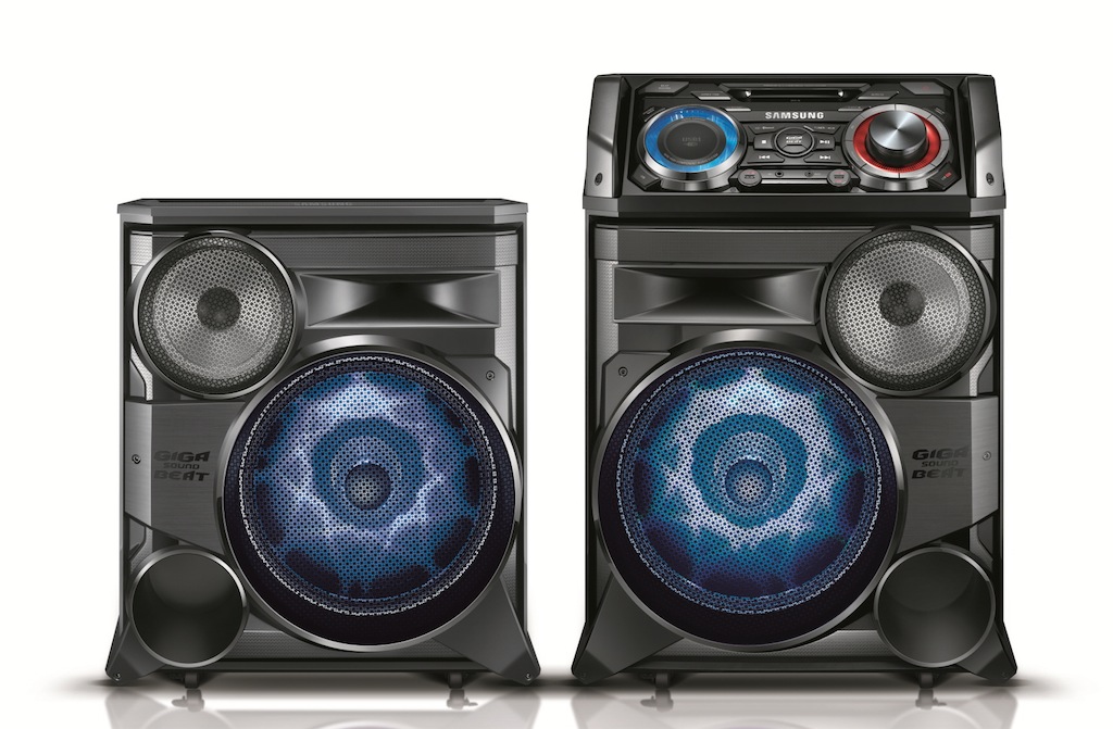 Otro de los nuevos productos presentados es el sistema de sonido Samsung Giga MX-HS8500, el primero hasta ahora que integra el propio sistema en los altavoces principales, con 2.500W. Incorpora además ruedas para mejorar la movilidad y ofrece un sonido potente con efectos de luz que se sincronizan al ritmo de la música.