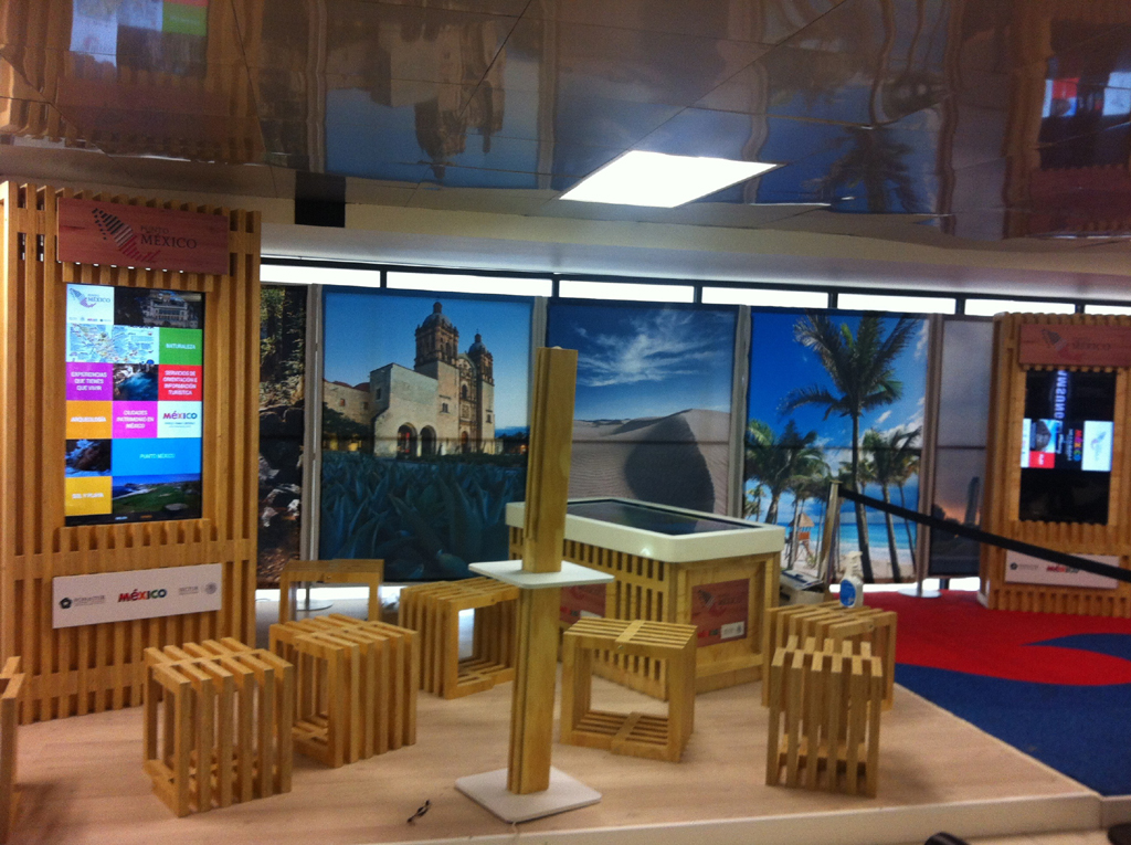 Logiciel virtuel a été l'entreprise chargée de concevoir et de développer cet espace dans lequel elle a installé 12 écrans tactiles 46 pouces Full HD deux touches et deux Atouch Interactive Point 55 pouces qui jouent un rôle particulier, comme principal poste d'information du Mexique. Une application touristique est installée sur dix des écrans où vous pourrez consulter des informations pertinentes sur les meilleures destinations à visiter dans le pays.. Dans les deux autres, un jeu interactif est proposé où les plus jeunes peuvent exercer leur mémoire en la gérant via l'appareil. Microsoft Kinect.