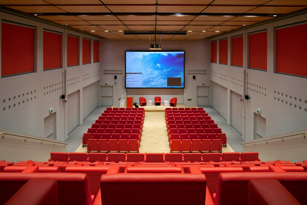 La sala de conferencias, de veinticuatro metros de largo por diez de ancho, puede acomodar hasta trescientas personas confortablemente sentadas, y si la ocasión lo requiere, la sala puede dividirse en dos espacios gracias a un muro acústico móvil de paneles acústicos fonoabsorbentes fabricados en madera y montados en un marco de metal. Las dos salas menores, de doce por diez metros aproximadamente, tienen cada una un aforo de ciento treinta asistentes.