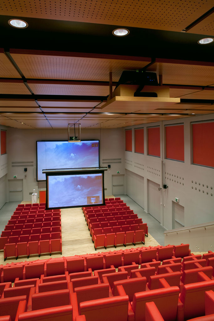 Lo mismo cabe decir de los subwoofers compactos de paso de banda Tannoy VS 10BP, montados sobre el suelo, ocultos tras los paneles de partición de la sala, y dotados de ventilación acústica. Cuando la sala se divide en dos se utiliza una configuración preprogramada en la plataforma digital de audio Biamp AudiaFlex que, además de posibilidades de routing, tiene también funciones de mezclado, égaliseur, filtres, cruzado, dynamique, retards, et plus.