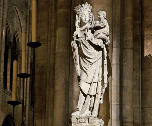 La iluminación revela los detalles de obras de arte únicas como la estatua de la Virgen y el Niño, que se trasladó a Notre-Dame en 1818 y es la más famosa de las 37 representaciones que contiene la catedral. La iluminación actual redefine el perfil de los personajes, al mismo tiempo que baña con una luz suave la escultura y las flores blancas ubicadas a sus pies.