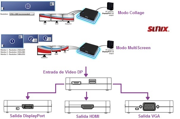 Intronique PC2010Le distributeur Intronique tiene disponible en el mercado el divisor multipantalla PC2010, con el que es posible conectar hasta tres pantallas desde una sola fuente de vídeo DisplayPort. Los monitores puede configurarse de diferentes modos, ya sea de manera independiente, c'est à dire, cada pantalla distribuye una señal de vídeo en modo extendido, o en conjunto formando un vídeo collage.