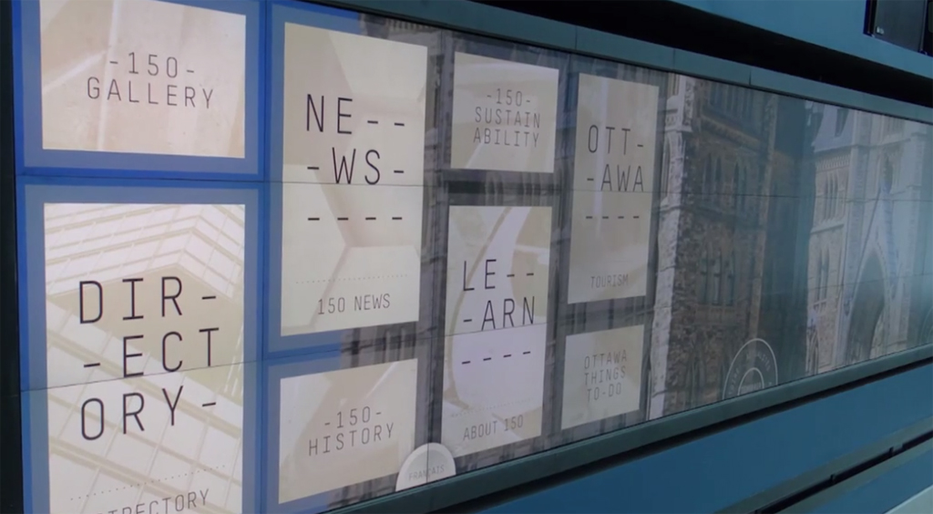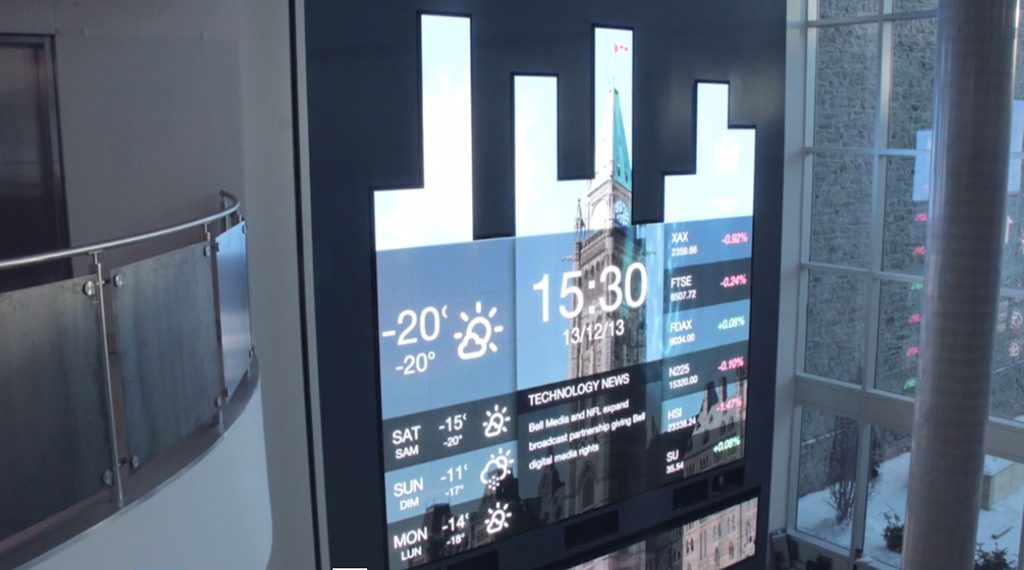 La zona del Winter Garden en el Performance Court de Ottawa está presidida por un videowall de 26 métros, composé de 48 Microtiles de Christie, con capacidades multitáctiles, oui 72 LED de Barco.