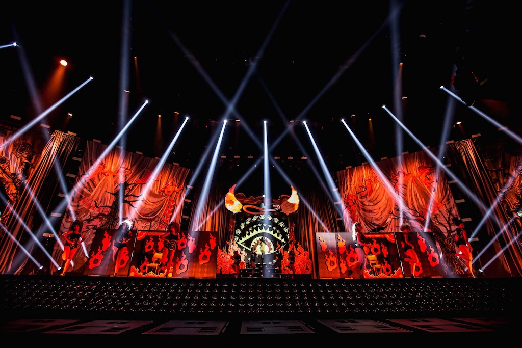 Trabajar con un escenario en constante movimiento y con proyección mapeada sobre las piezas escénicas, como apunta este diseñador, le dio la oportunidad de incluir todos los elementos visuales, haciendo recortes con los haces para que las proyecciones fueran vistas sin ocultar a la artista. En cuanto a los bailarines, su opción fue trabajar con mucho color y buenos niveles de luz en todo momento para las cámaras, con una temperatura base de 5600 K.