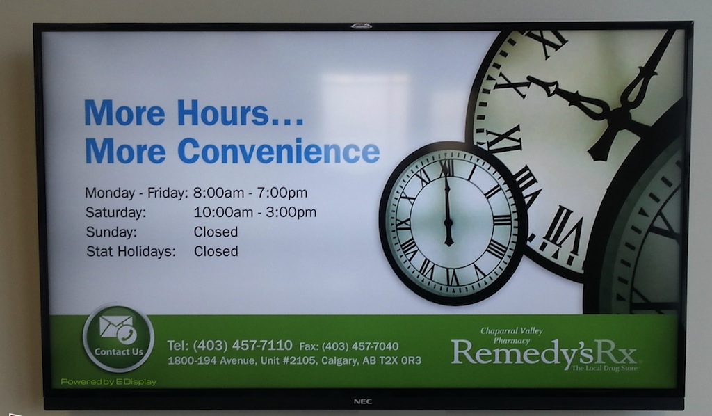 La red de digital signage para la cadena farmacéutica canadiense Remedy’s RX diseñada e integrada por E-Display se basa en una solución completa como servicio, compuesta por pantallas digitales de gran formato, reproductores y el software para la gestión de contenido digital E-Display Signage as a service.