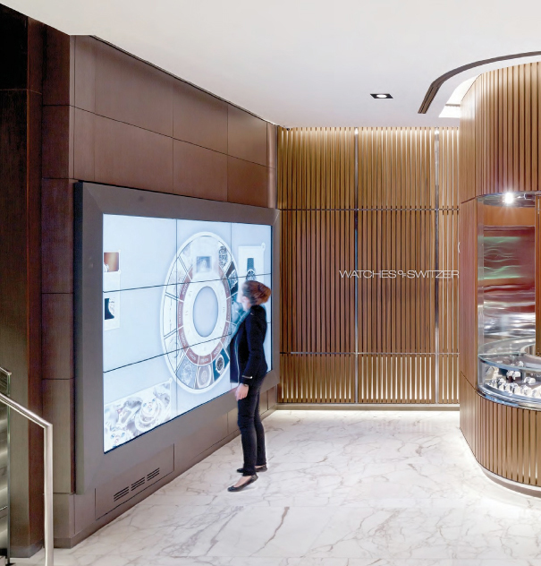 Con objeto de ofrecer un mejor servicio, Watches of Switzerland ha instalado en esta tienda insignia una pantalla táctil interactiva de 3 x por 2 metros que ofrece a los clientes un contenido interactivo cuya temática principal es la historia de los relojes y la presentación de amplio stock de modelos que se comercializan.