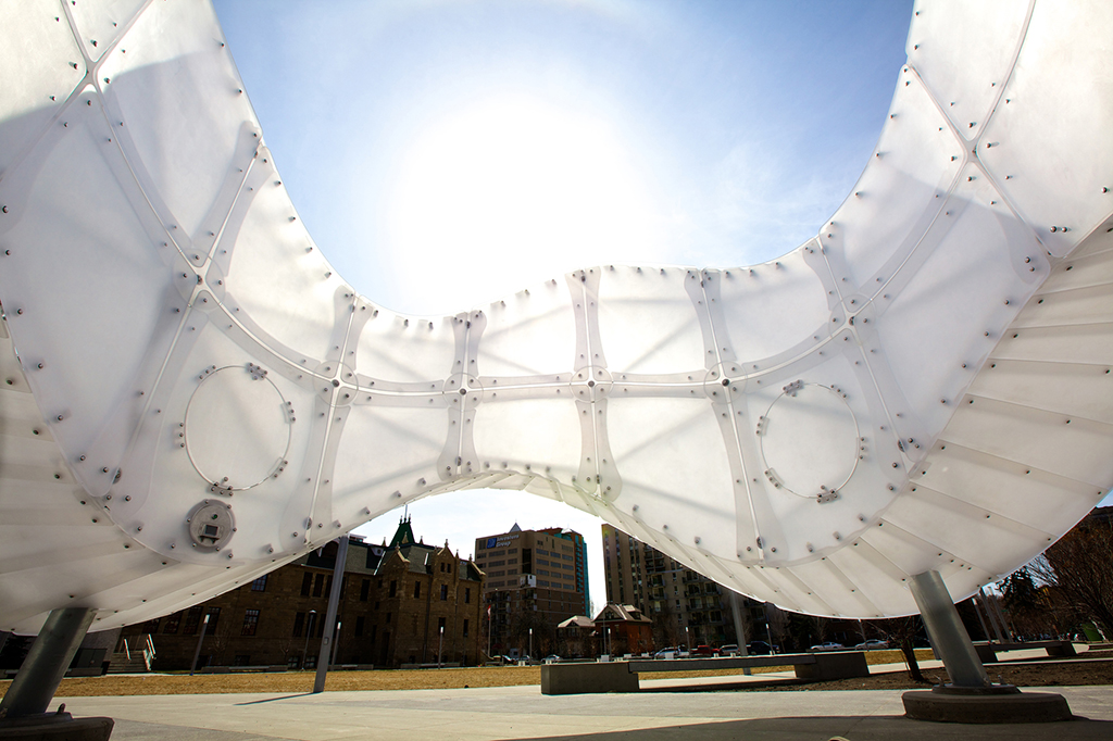 El histórico circuito del tranvía Beltline y el arco Chinook que cubre periódicamente el cielo han sido la inspiración para que los artistas Joe O’Connell y Blessing Hancock diseñaran esta obra de arte de bordes nítidos y curvas redondeadas que está instalada en el parque Barb Scottm de la ciudad de Calgary (Canada). Un proyecto que ha sido construido por la empresa Creative Machines y que fue inaugurada este verano.