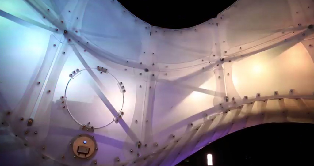 Chinook Arc es una escultura interactiva, construida con materiales acrílicos y dotada de tecnología LED y sensores, que permite que los visitantes se conviertan en participantes activos de la experiencia, cambiando la secuencia de iluminación a través de sus movimientos.