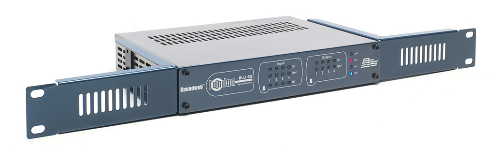 El BLU-50 es un procesador de media unidad de rack que ofrece una configuración fija de cuatro entradas y cuatro salidas, proceso de señal configurable, proceso lógico y Blu link. Este equipo se puede alimentar con la fuente de alimentación de 12VDC que incorpora, aunque también acepta alimentación de 12-48 VDC inyectada a través de un conector tipo bloque terminal. El BLU-50 también admite alimentación vía Ethernet (PoE+) a través del puerto Ethernet. Esta última opción permite la alimentación, configuration, control y monitorización del sistema mediante un solo cable Cat 5e.