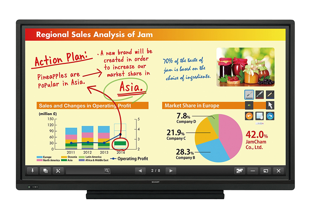 Estas pantallas incluyen función de pizarra, modo de presentación y la posibilidad de reproducir vídeo sin precisar la conexión a un PC externo, y en su parte frontal integra altavoces. La pantalla está diseñada con un resistente cristal que reduce las huellas digitales y la reflexión.