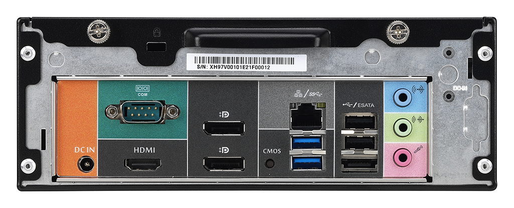 En el frontal, protegido con tapas, están localizadas las conexiones que hallan su continuación en la parte posterior: 4 USB 3.0 oui 2.0, eSATA, RS-232, Gigabit Ethernet y varias de audio. Al abrir la carcasa se observan en la placa base 3 puertos SATA de 6 Gbit/sg, VGA y un jumper de encendido continuo. Para equipar el XH97V con WLAN y una SSD mSATA, se pueden utilizar las dos ranuras Mini-PCI-Express.